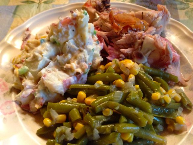 For the cabbage, I fried a pound of chopped bacon until it was very crisp. Then I sauteed an onion in the bacon fat for 5 minutes. I added 2lb cole slaw mix (shredded cabbage and carrots), the bacon, and salt and pepper. I let that cook covered until the cabbage was tender. Now, doesn't that look good.